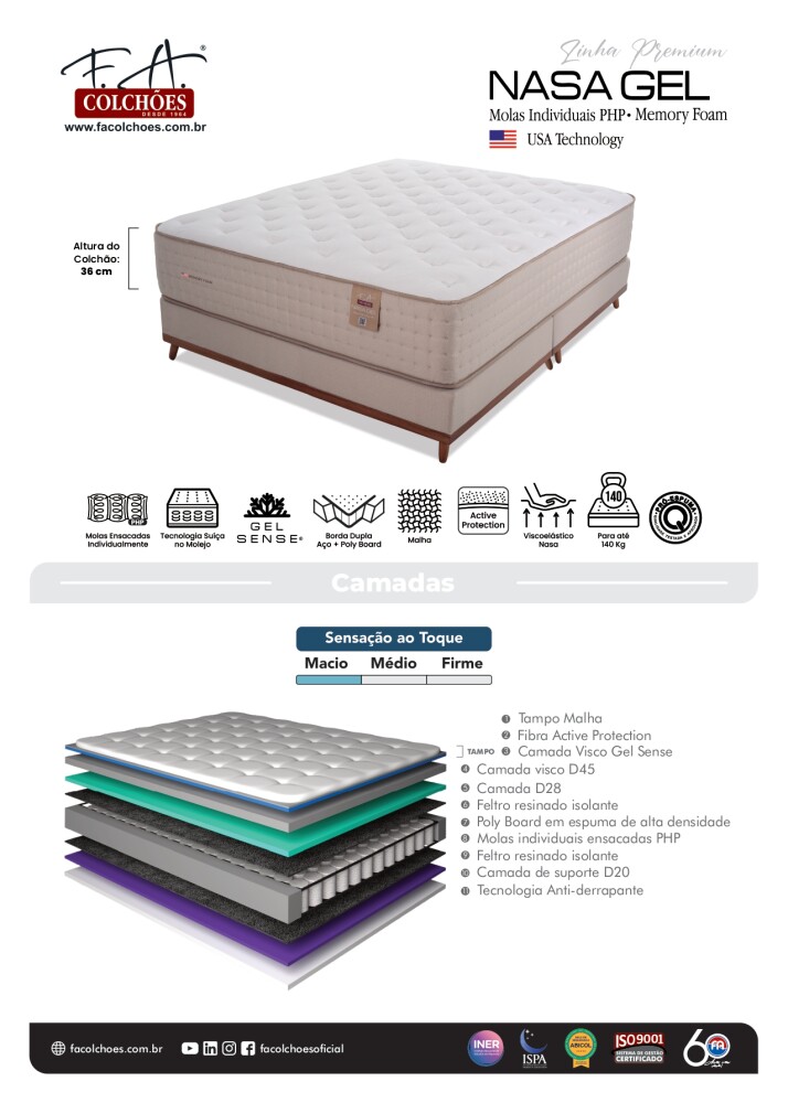 Pillow Top de espuma viscoelástica GelSense: La espuma viscoelástica se adapta a los puntos de presión del cuerpo, especialmente en hombros y caderas, reduciendo los movimientos nocturnos y mejorando la circulación sanguínea. El GelSense absorbe el calor corporal, brindando noches más frescas y confortables.