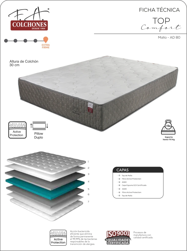 El Colchón Top Comfort Queen es perfecto para quien busca un colchón firme y resistente, sin perder el confort de F.A. Colchones. Es un colchón de alta durabilidad, que cuenta con la tecnología Active Protection en su parte superior de malla que elimina el 99,99% de las bacterias. ¡Es perfecto para tu noche de sueño!