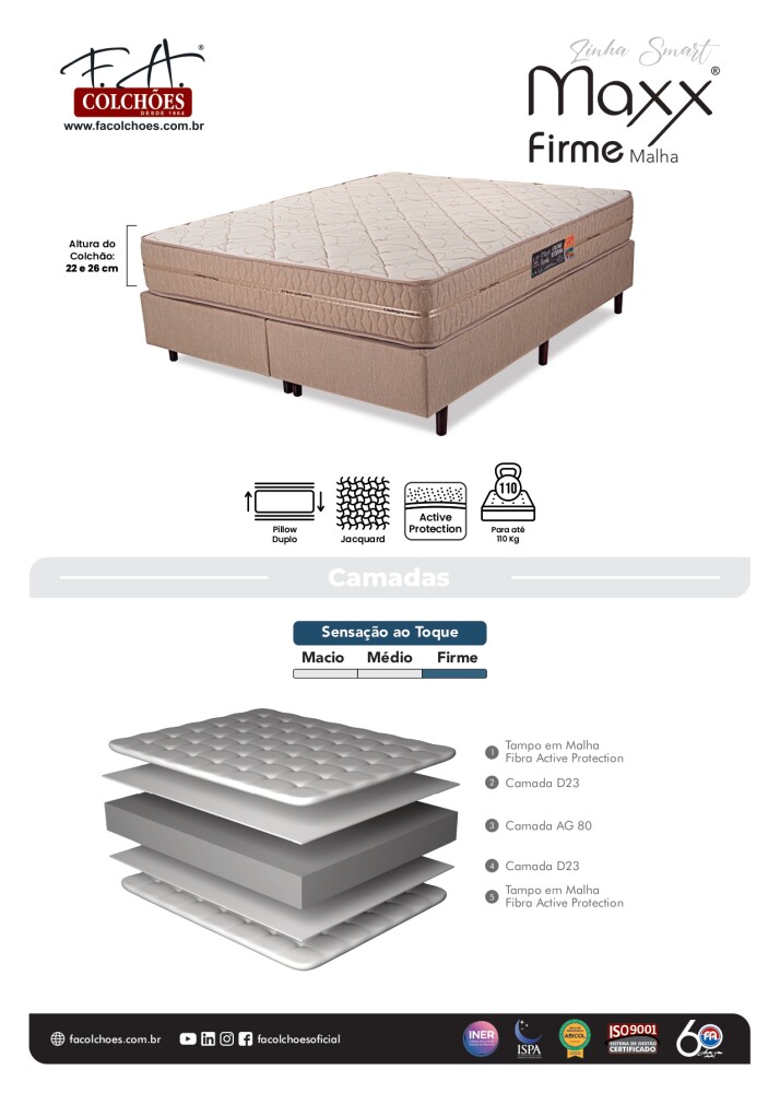 USD 452,20 El colchón combina 5 capas de confort y tecnología: tejido en punto, fibras Active Protection, espumas AG80 y D23 certificada. Proporciona firmeza, durabilidad y protección hipoalergénica, asegurando un descanso saludable y cómodo.